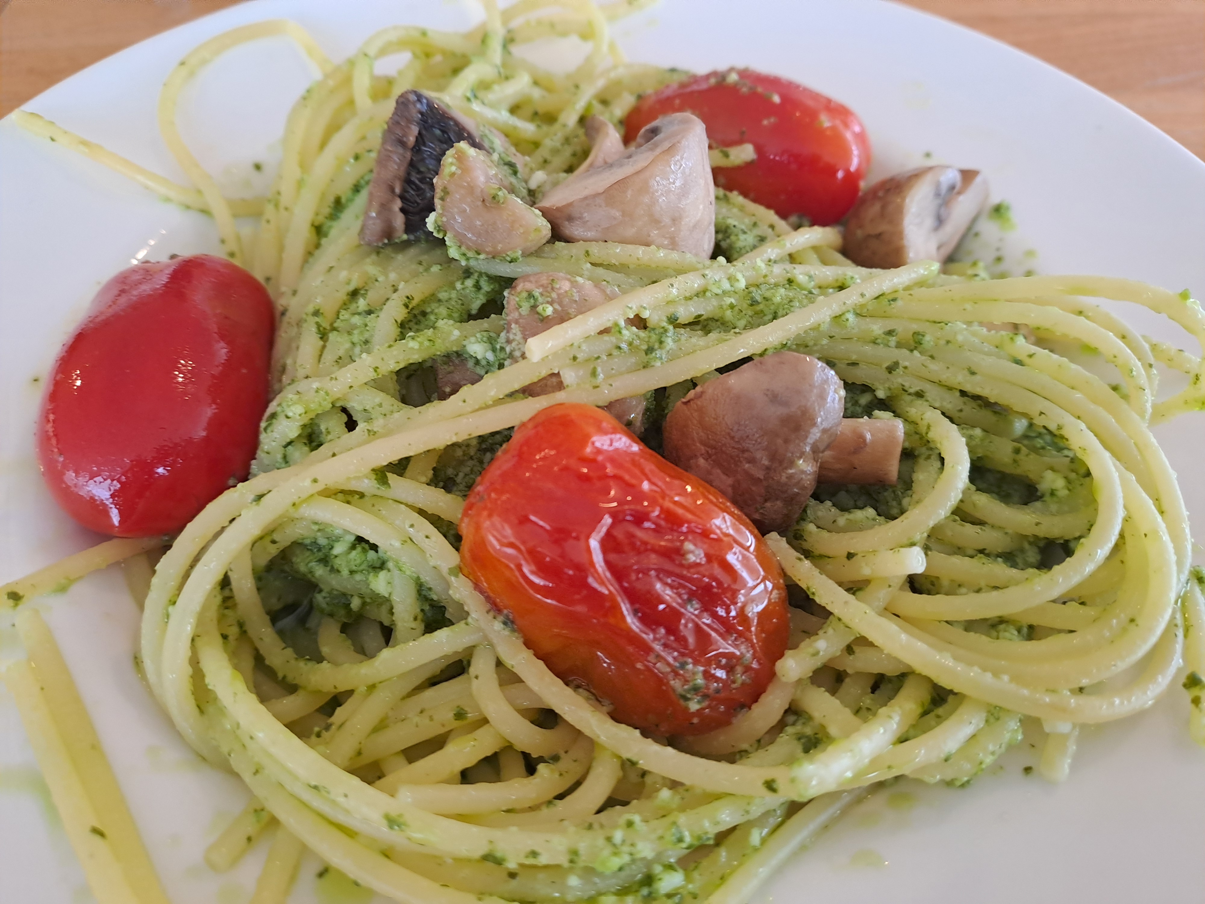 ESPAGUETTI CON CHAMPIÑONES, CHERRY Y PESTO